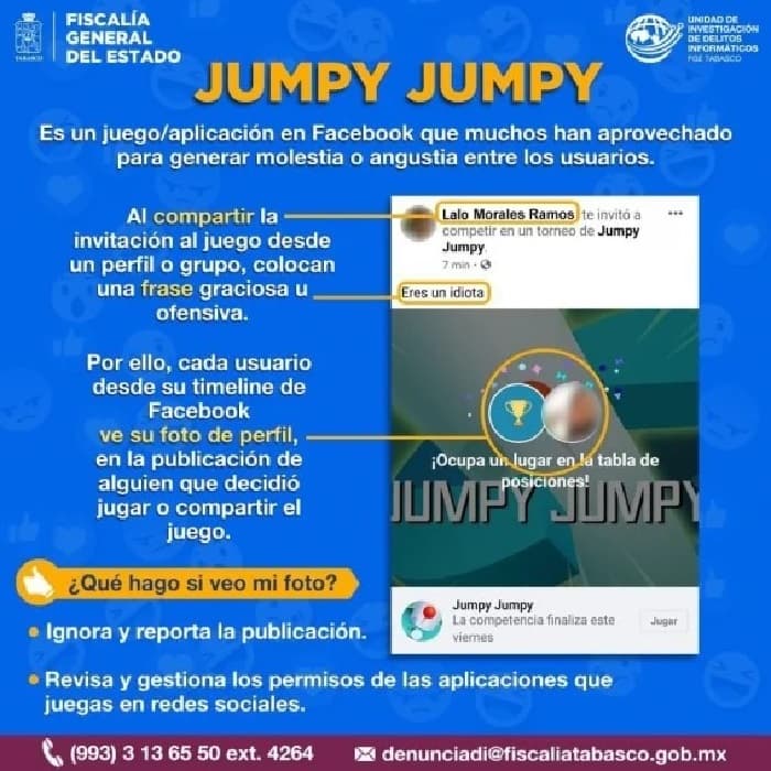 En México ya salió una alerta sobre el juego llamado “Jumpy Jumpy”. Se trata de una app añadida a Facebook que genera molestias y confusiones entre los usuarios de la red social, con afirmaciones falsa. En este sentido, la unidad Fiscal de Tabasco, un estado mexicano explicó en un comunicado que el juego consiste en poner un título como “este no supera a su ex” o “la foto de mi amante” y en la imagen aparece el perfil de la persona que está viendo la publicación, aunque los demás ven algo diferente en su timeline. Según el Universal, este juego es aprovechado por muchas personas para generar molestias y angustias entre los usuarios de la red social, tanto en Paraguay, como en todo el mundo.Algunos afectados solo reportan el contenidos como falso, mientras que otros simplemente hacen memes con las capturas de pantallas. Se recomienda que quienes se vean afectado por el juego, ignorar la publicación y reportarlo a Facebook para revisar y gestionar los permisos de la aplicación en las redes.