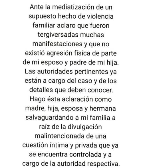 “Ante la mediatización de un supuesto hecho de violencia familiar aclaro que fueron tergiversadas muchas manifestaciones y que no existió agresión física de parte de mi esposo y padre de mi hija. Las autoridades pertinentes ya están a cargo del caso y de los detalles que deben conocer. Hago esta aclaración como madre, hija, esposa y hermana salvaguardando a mi familia a raíz de la divulgación malintencionada de una cuestión íntima y privada que ya se encuentra controlada y a cargo de la autoridad respectiva”, posteó en Instagram.