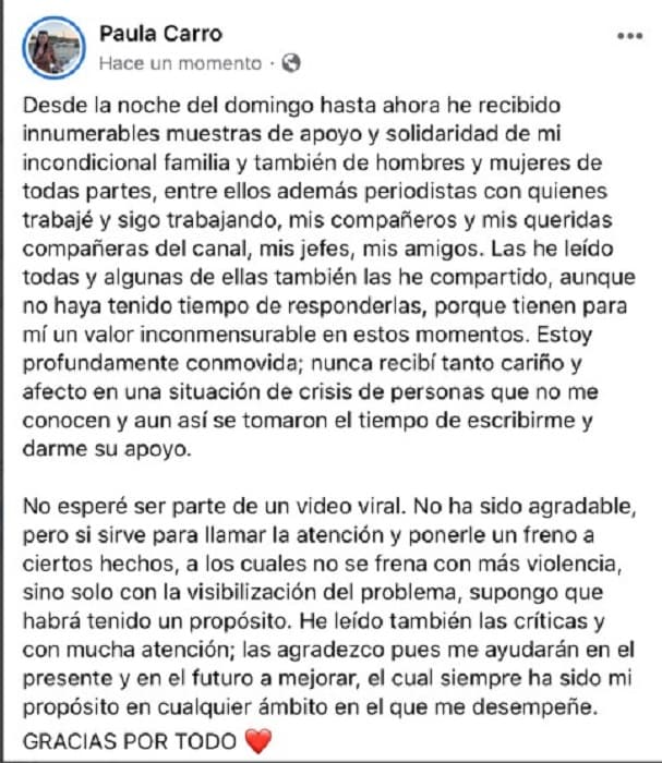 En una extensa publicación en sus redes sociales, la periodista Paula Carro se expidió sobre la polémica que se generó entorno a la discusión que tuvo con su compañero Roberto Pérez, el pasado domingo.“Estoy profundamente conmovida, nunca recibí tanto cariño y afecto en una situación de crisis, de personas que no me conocen y aun así se tomaron el tiempo de escribirme y darme su apoyo”, mencionó la periodista en su publicación. Resaltó que si bien no esperó ser parte de un video viral, pues “no ha sido agradable”, el mismo puede servir para llamar la atención y ponerle freno a ciertos hechos, que no se frena con más violencia, sino con “la visibilización del problema”. “He leído también las críticas y con mucha atención. Las agradezco, pues me ayudarán en el presente y en el futuro a mejorar”, resaltó. El pasado domingo los periodista Roberto Pérez y Paula Carro tuvieron una acalorada discusión en un programa en vivo, mientras entrevistaban al abogado constitucionalista José González Macchi. El momento se hizo viral en Twitter.