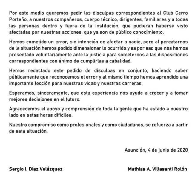 “Por este medio queremos pedir las disculpas correspondientes al Club Cerro Porteño, a nuestros compañeros, cuerpo técnico, dirigentes, familiares y a todas las personas dentro y fuera de la institución, que pudieran haberse visto afectadas por nuestras acciones, que ya son de público conocimiento”, comienza señalando el escrito difundido en redes sociales.
