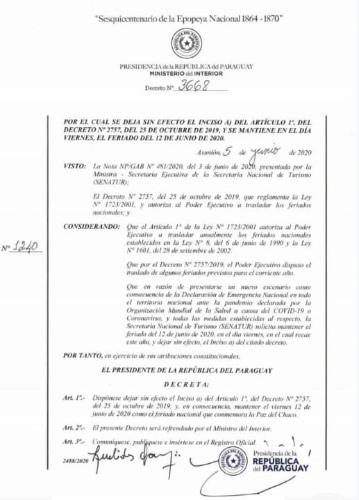 En el considerando se apunta: “Que en razón de presentarse un nuevo escenario como consecuencia de la Declaración de Emergencia Nacional en todo el territorio nacional ante la pandemia declarada por la Organización Mundial de la Salud a causa del COVID-19 o Coronavirus, y todas las medidas establecidas al respecto, la Secretaría Nacional de Turismo (SENATUR) solicita mantener el feriado del 12 de junio de 2020, en el día viernes, en el cual recae este año, y dejar sin efecto, el Inciso a) del citado decreto”.
