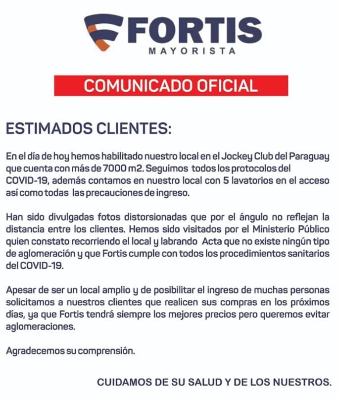 El local conocido como Fortis Mayorista emitió un comunicado en el cual trata de aclarar la presunta aglomeración en la sucursal del Jockey Club del Paraguay, en la capital.
