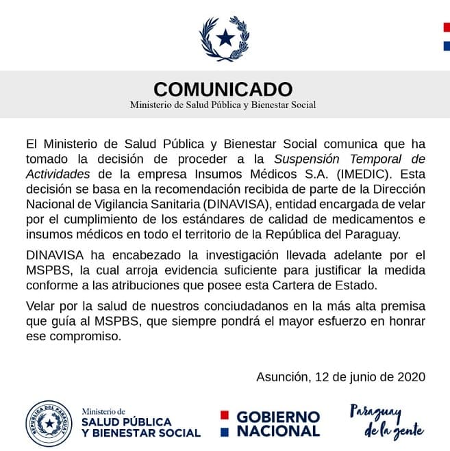 IMEDIC es la misma compañía que firmó contrato para proveer insumos para la lucha contra la pandemia. El proceso resultó ser un fiasco y Julio Mazzoleni decidió rescindir el vínculo.