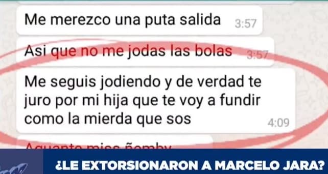 En el contexto de la denuncia, el programa El Repasador, del canal Trece, dio a conocer capturas de conversaciones en la cuales la denunciante supuestamente amenaza a Jara con “fundirle”.