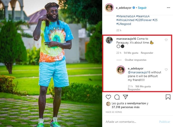 El sábado, Adebayor publicó una imagen en Instagram, donde un usuario le consultó sobre su retorno. El delantero togolés respondió: “Sin avión será difícil, mi amigo”.
