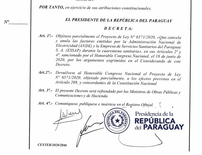 El presidente vetó parcialmente la ley que anula las facturas de ANDE y ESSAP de los meses de marzo, abril, mayo, junio, julio y agosto.