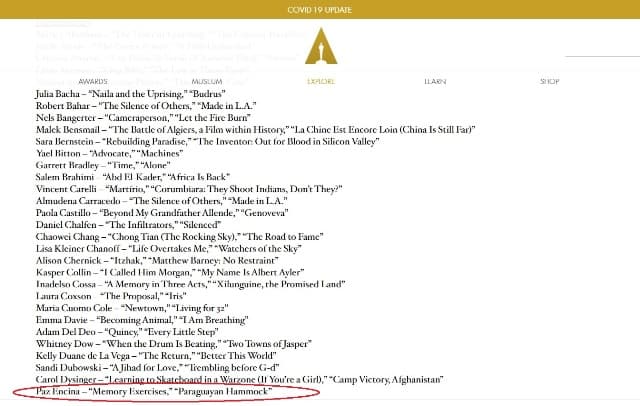 La cineasta paraguaya Paz Encina pasa a ser miembro de La Academia de Artes y Ciencias Cinematográficas de Estados Unidos, conocida por entregar anualmente los famosos premios Óscar. Esto se dio luego de la invitación de la propia academia, que la tuvo en cuenta por su trabajo Ejercicios de la memoria, documental del 2016, además de la reconocida Hamaca Paraguaya.Ejercicios de memoria, es un documental que a partir del caso Goiburú, hace una refexión sobre la dictadura del General Stroessner y la represión. La película, además de recorrer importantes festivales de cine como el 64º Festival de San Sebastián (España), en el 2017 realizó una gira por museos de Estados Unidos, presentando su obra, proyectando la cinta en el Harvard Film Archive, en Boston, el Berkeley Art Museum, y el Museo de Arte Moderno, el MoMA de Nueva York.