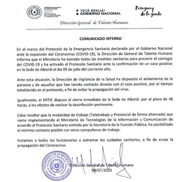 Un funcionario del Ministerio de Tecnologías de la Información y Comunicación (MITIC) informó que un funcionario dio positivo a coronavirus.
