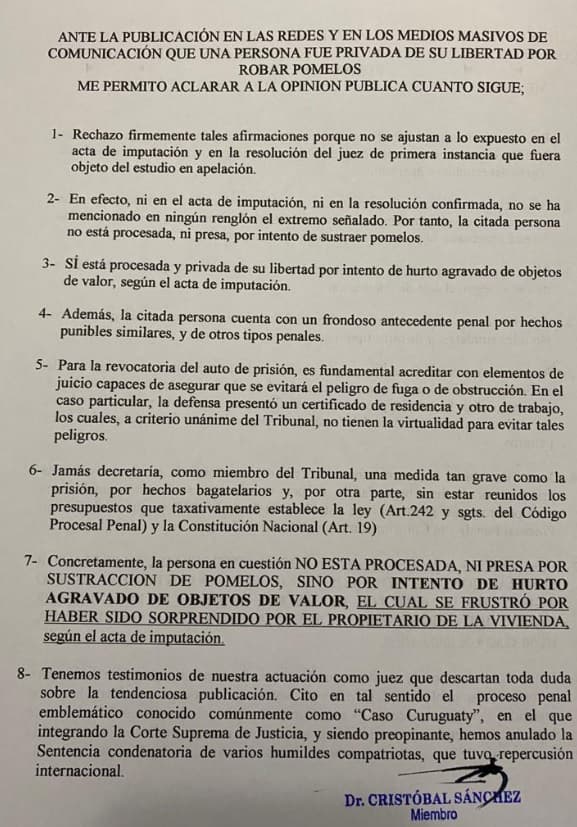 “Concretamente, la persona en cuestión no está procesada, ni presa por sustracción de pomelos, sino por intento de hurto agravado de objetos de valor, el cual se frustró por haber sido sorprendido por el propietario de la vivienda, según el acta de imputación”, expresa la parte más sustanciosa del escrito.