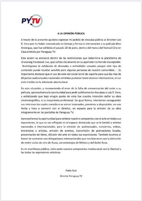 “A través de la presente quisiera expresar mi pedido de disculpa pública al director Luis R. Vera por no haber comunicado en tiempo y forma la intervención a su película Miss Ameriguá, que fue exhibida el pasado 29 de junio, dentro del marco del festival Cine en Casa emitido por Paraguay TV”, inicia el comunicado del director de Paraguay TV, Pablo Noé.