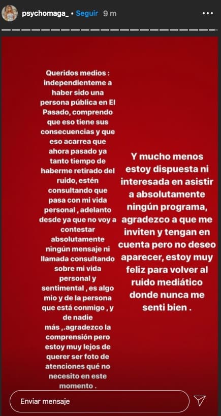 En un texto compartido a través de su cuenta en Instagram, la mujer manifestó que tampoco quería hablar de su vida privada.