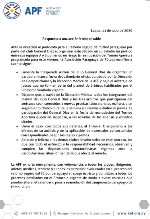 Reitera el pedido de cumplimiento del protocolo sanitario para el retorno del fútbol en medio de la pandemia de coronavirus.