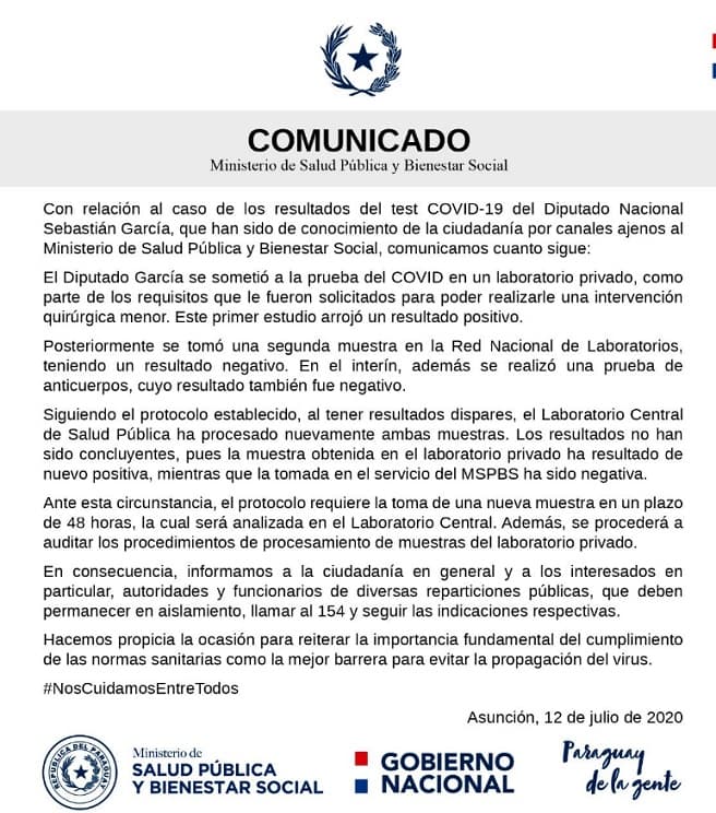 El Ministerio de Salud lanzó un comunicado sobre el caso del diputado Sebastián García, quien dio positivo en el sector privado, pero no así en el Laboratorio Central de la cartera sanitaria.