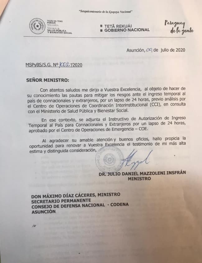 La periodista Estela Ruiz Díaz publicó el documento que permitió la venida del empresario argentino. Como se puede ver en el documento, el propio Julio Mazzoleni dio su visto bueno a través de su firma.