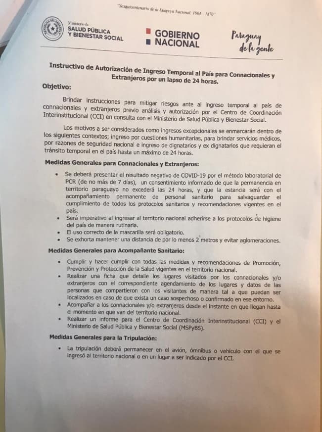 En el escrito se puede leer las pautas que deben cumplir las personas que desean ingresar al país por el término de menos de 24 horas.