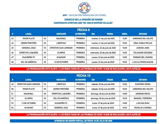 De tal forma, la Fecha 9 del inicia este martes 21 de julio con el encuentro entre River Plate y Nacional a las 16:00 en los Jardines del Kelito. Ese mismo día se enfrentarán en la Nueva Olla, Cerro Porteño y Libertad a las 18:30.