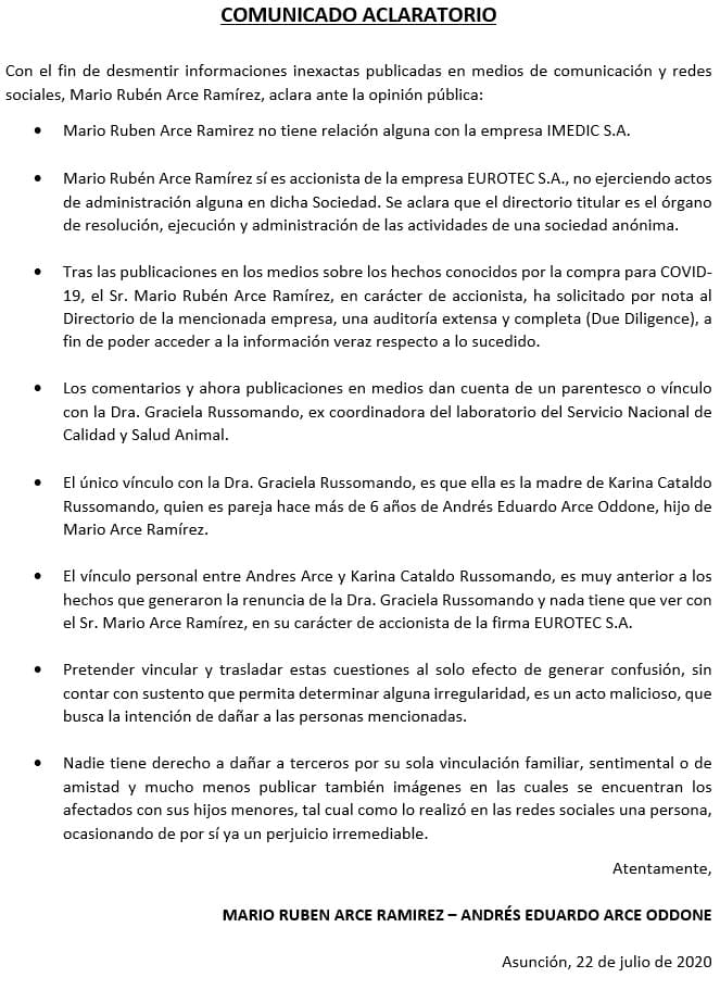 “El único vínculo con la Dra. Graciela Russomando, es que ella es la madre de Karina Cataldo Russomando, quien es pareja hace más de 6 años de Andrés Eduardo Arce Oddone, hijo de Mario Arce Ramírez”, se reconoce en el comunicado.