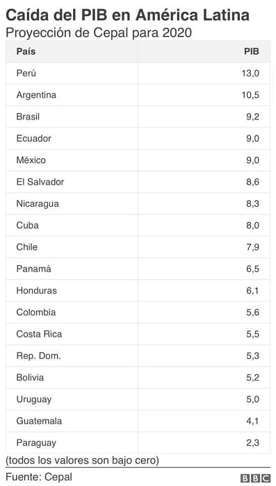 En sentido y de forma particular, la Cepal hace un desglose por países y ubica como los más afectados a Venezuela (con -26% de crecimiento); Perú (con -13%), Argentina (-10,5%) y Brasil (-9,2%).