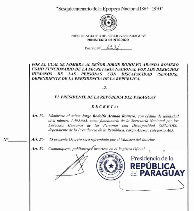 De acuerdo a lo que pudo corroborar este medio se trata Jorge Rodolfo Aranda Romero, quien fue nombrado por el Poder Ejecutivo el 1 de abril del 2019 como asesor de la Secretaría Nacional por los Derechos Humanos de las Personas con Discapacidad (Senadis).