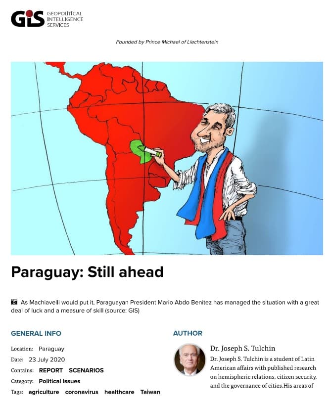 De acuerdo al informe realizado por el Dr. Joseph S. Tulchin, del Servicio de Inteligencia Geopolítica, Abdo Benítez, junto con sus ministros, logrará una estabilidad gradual de la situación económica del país.
