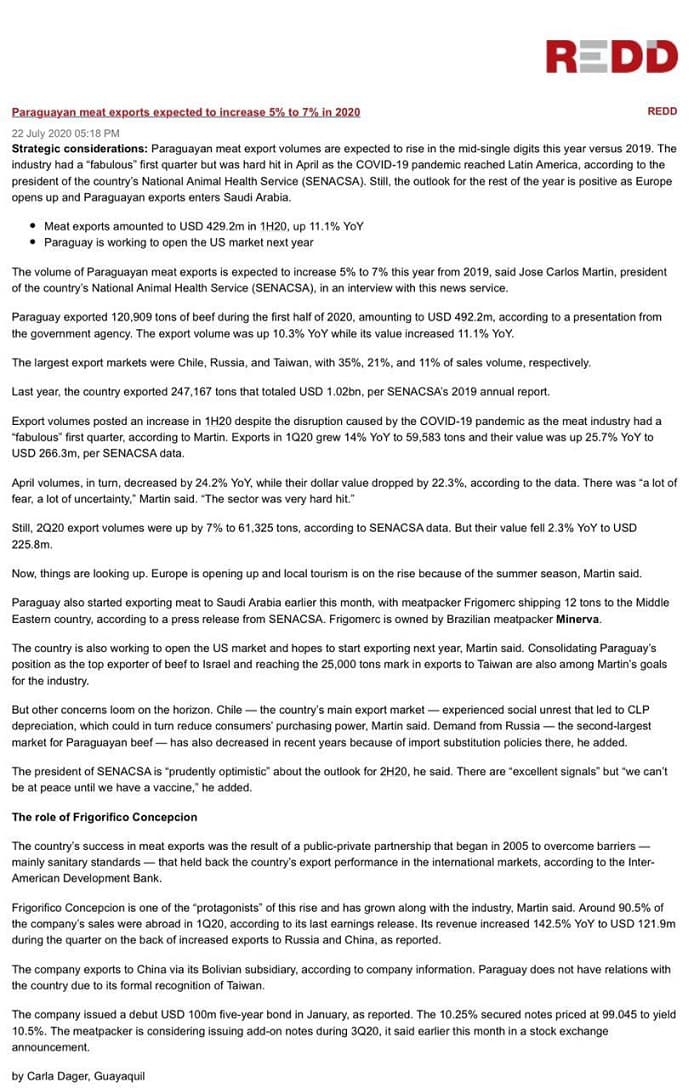REDD Intelligence es la agencia de noticias financieras de mercados emergentes para los Estados Unidos y emitió un extenso análisis sobre la situación que vive el país, con relación a su mercado cárnico.