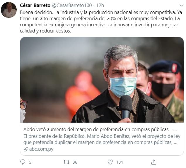 El exmnistro de Hacienda, el economista César Barreto, también se expidió sobre la decisión tomada por el Ejecutivo. “Buena decisión. La industria y la producción nacional es muy competitiva. Ya tiene un alto margen de preferencia del 20% en las compras del Estado. La competencia extranjera genera incentivos a innovar e invertir para mejorar calidad y reducir costos”, publicó en redes sociales.