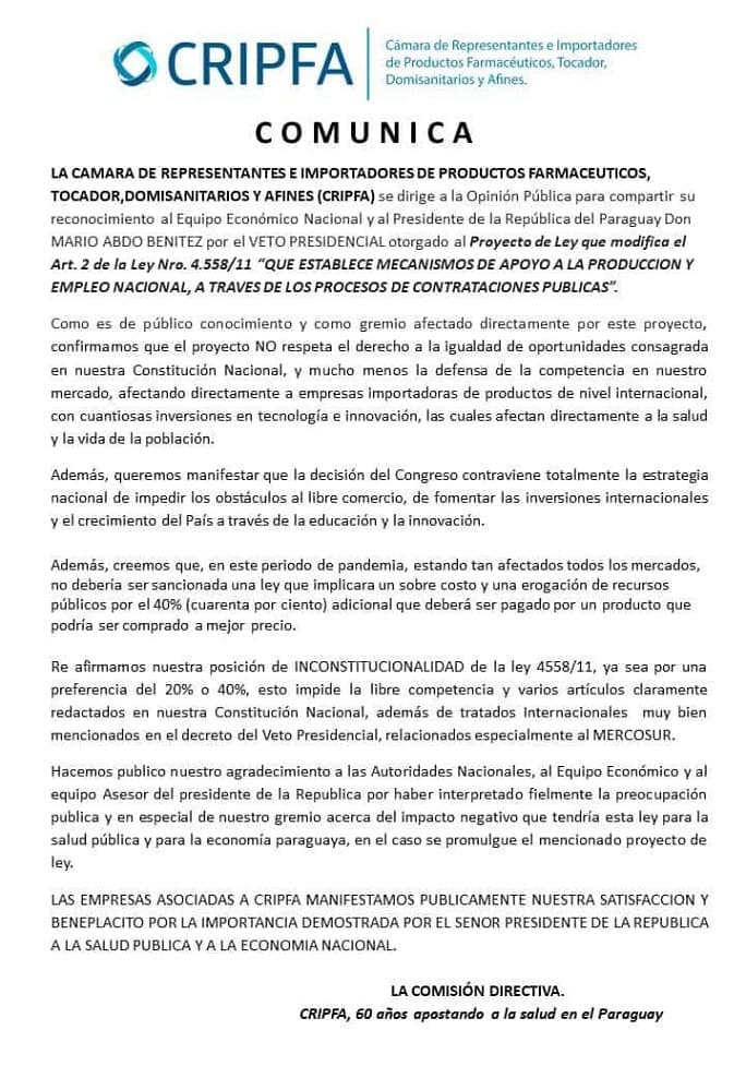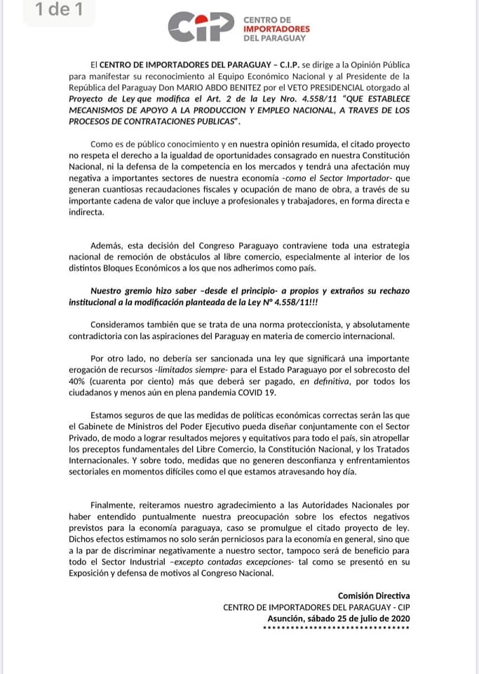 Ante esta situación, varios gremios demostraron su apoyo a la decisión del Ejecutivo, ellos son el Centro de Importadores del Paraguay (CIP), la Cámara Nacional de Comercio y Servicios de Paraguay (CNCSP), la Cámara de Distribuidores de Automotores y Maquinarias (CADAM) y la Cámara de Representantes e Importadores de Productos Farmacéuticos, Tocador, Domisanitarios y Afines (CRIPFA).