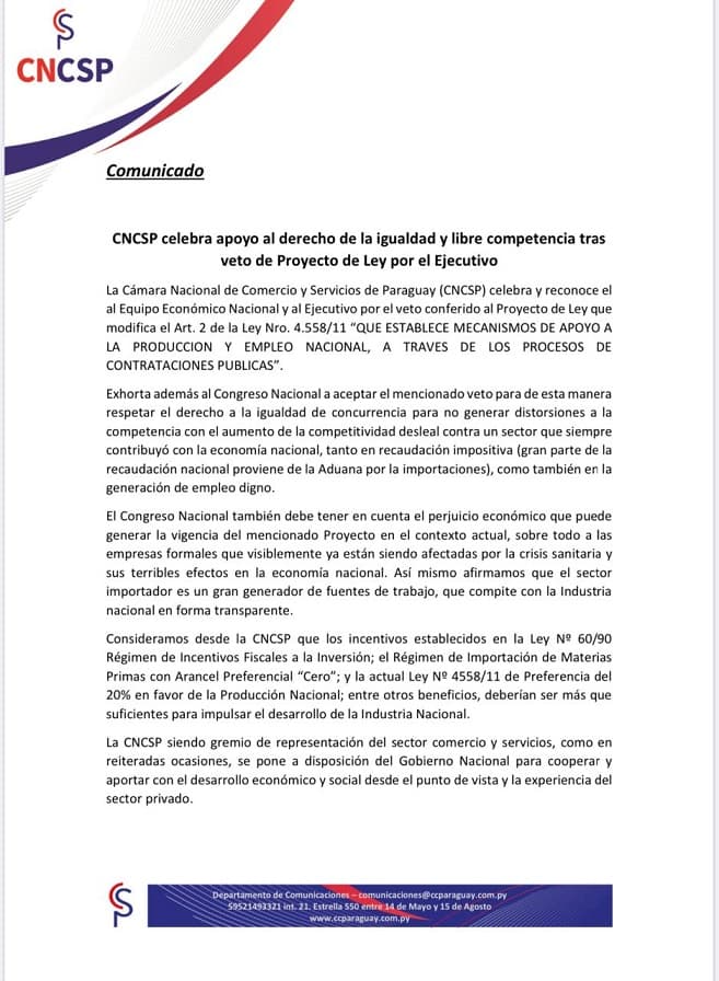 Por su parte, la CNCSP exhorta al Congreso Nacional a aceptar el veto “para de esta manera respetar el derecho a la igualdad de concurrencia para no generar distorsiones a la competencia con el aumento de la competitividad desleal contra un sector que siempre contribuyó con la economía nacional, tanto en la recaudación impositiva (gran parte de la recaudación nacional proviene de la Aduana por las importaciones), como también en la generación de empleo”.