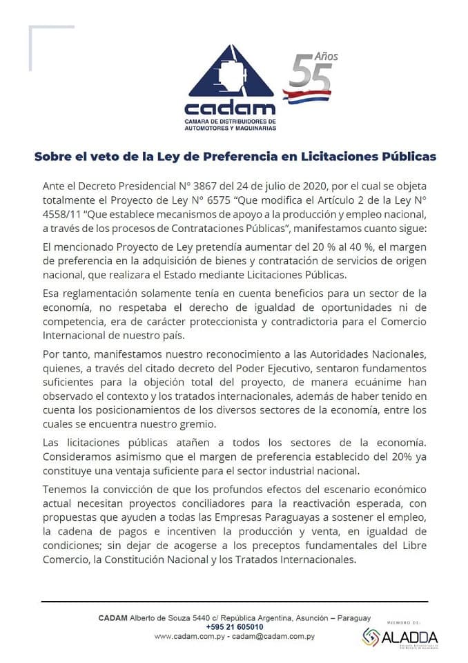 En cuanto a la CADAM, apunta que en la ley solamente tenía en cuenta beneficios para un sector de la economía. “Manifestamos nuestro reconocimiento a las Autoridades Nacionales, quienes, a través del citado decreto del Poder Ejecutivo, sentaron fundamentos suficientes para la objeción total del proyecto”.