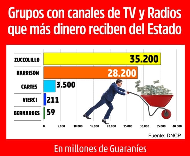 Tomando datos del portal de la Dirección Nacional de Contrataciones Públicas (DNCP) es fácil ver el dinero que mueven los conglomerados empresariales, que a la vez manejan los principales medios de comunicación, específicamente quienes hoy día combinan el alcance de Radio y TV.