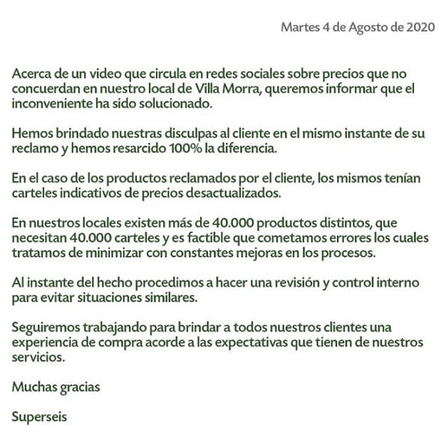 El material fue viralizado, durante la jornada del miércoles. En ese contexto, el supermercado denunciado emitió un comunicado informando que el inconveniente ocurrido en su sucursal de Villa Morra, ya fue subsanado.