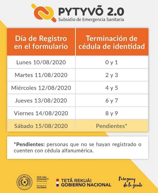 El Ministerio de Hacienda habilitó para que interesados puedan acceder a los beneficios del subsidio estatal Pytyvõ 2.0. La cartera del Estado estableció un calendario de acuerdo a la terminación de su cédula.