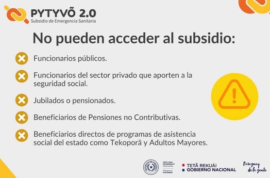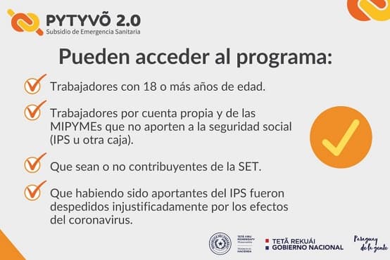 Pueden acceder al programa, trabajadores con 18 años o más, trabajadores por cuenta propia y Mypimes que no aporten a la seguridad social, que sean o no contribuyentes de la SET y que habiendo aportado al IPS fueron despedidos injustificadamente por los efectos de la pandemia.