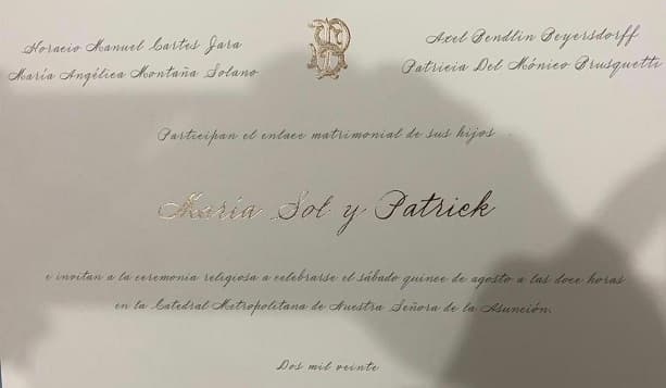 La hija del expresidente Horacio Cartes, María Sol, tiene previsto casarse este sábado. Se filtró una tarjeta de invitación, la cual consigna que incluso un hisopado.