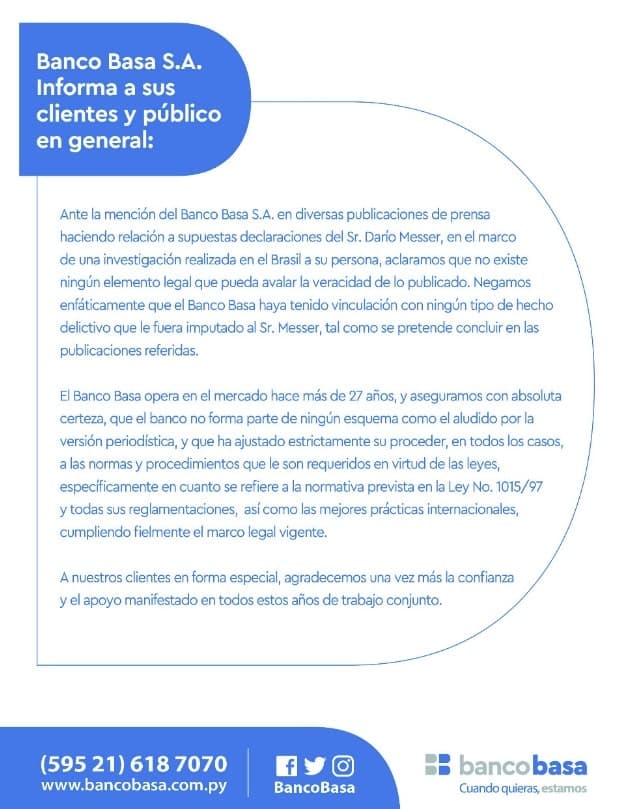 “Ante la mención del Banco Basa S.A. en diversas publicaciones de prensa haciendo relación a supuestas declaraciones del Sr. Darío Messer, en el marco de una investigación realizada en el Brasil a su persona, aclaramos que no existe ningún elemento legal que pueda avalar la veracidad de lo publicado”, dice la primera parte del escrito publicado, a la vez, por medios del Grupo Cartes, como La Nación y GEN.