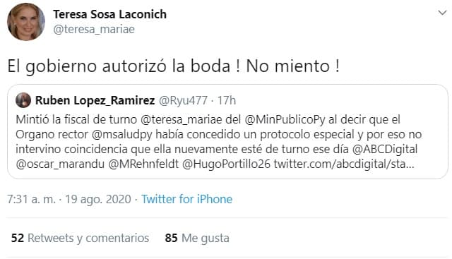 “Significa que este señor (…), pero su conducta es una conducta hipócrita, porque resulta que él está ciego, sordo y mudo de lo que acontece en la República y entonces él viene y plantea de que no se autorizó la boda y resulta que él es el representante legal para mitigar, controlar y prevenir la expansión del Covid en la República del Paraguay, no es el Ministerio Público, ni la policía”, lanzó tajante.