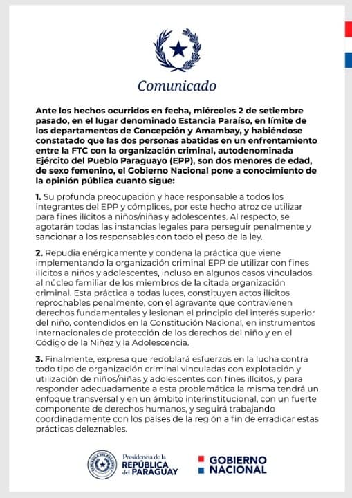 La Presidencia de la República lanzó un comunicado sobre la muerte de dos niñas, quienes se encontraban en el campamento del autodenominado Ejército del Pueblo Paraguayo (EPP).
