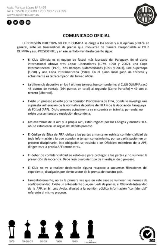 El Club Olimpia emitió un comunicado en el cual se expide sobre las supuestas pruebas filtradas y que dejarían en evidencia hechos de amaño en partidos del fútbol paraguayo.