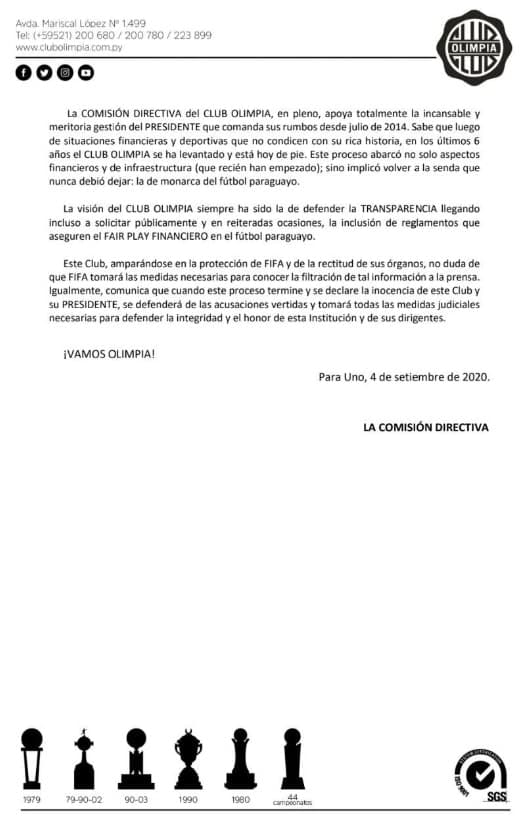 En el comunicado, el club deja en claro la diferencia que obtuvo en los últimos campeonatos sobre Cerro Porteño y Libertad, sus principales perseguidores.