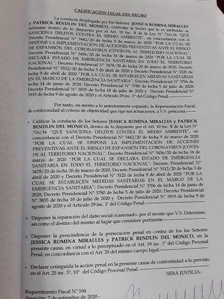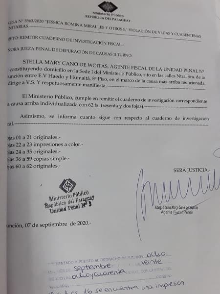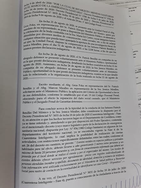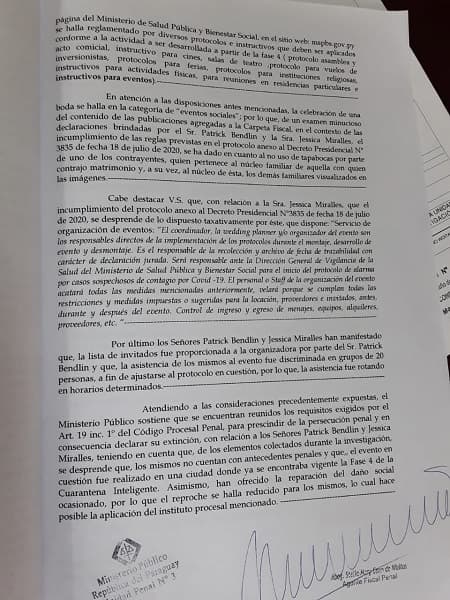 En ese sentido, la representante del Ministerio Público alegó que la boda se realizó en Cordillera, departamento que ya estaba en fase 4, mediante decreto 3835/2020.