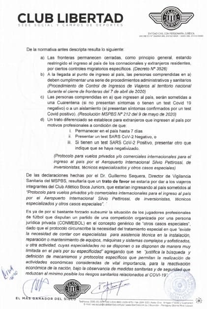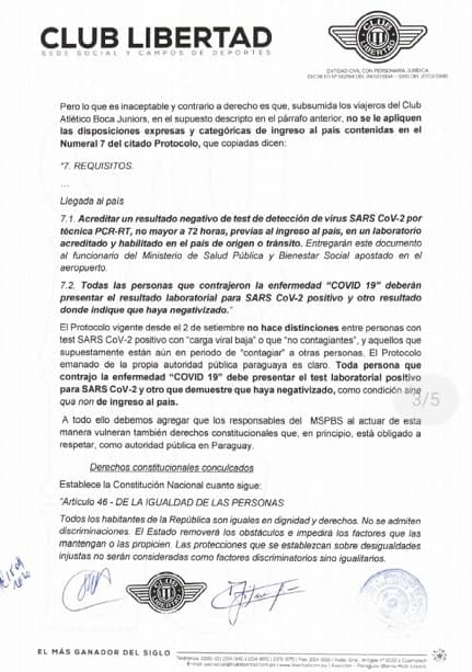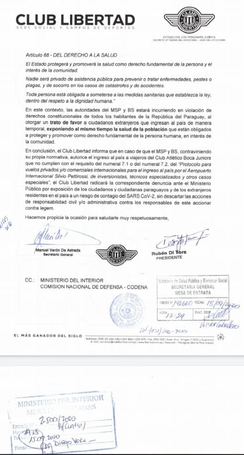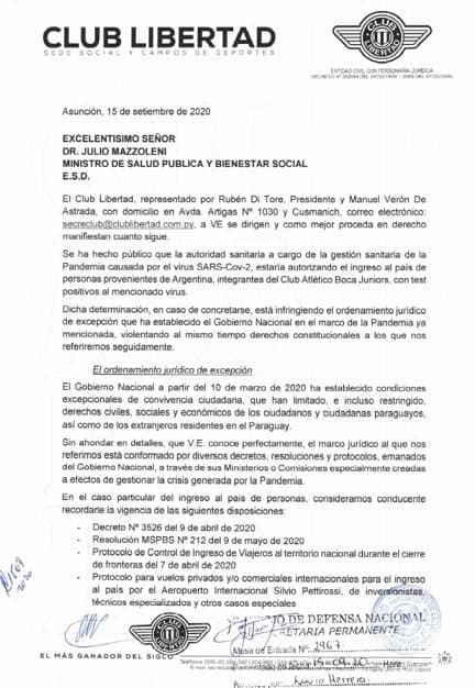 En una extensa nota, Libertad apela a protocolos, decretos y hasta la Constitución Nacional, para finalmente amenazar a Mazzoleni, para que no deje ingresar a los jugadores de Boca Juniors que no estén en condiciones, ya que en el plantel Xeneize se dieron varios casos de Covid-19.