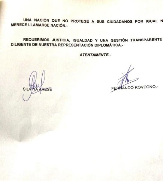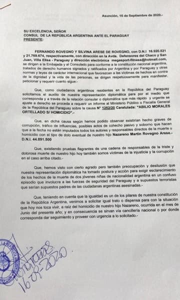 Los padres del joven Nazareno, Roberto Rovegno y Silvina Aresse, presentaron una nota a la Embajada y el Consulado de Argentina en Paraguay, solicitando el auxilio de su representación diplomática para que “a través de la relación consular o diplomática se proceda según corresponda a derecho para requerir un informe al Ministerio Público sobre la causa N° 1252/20 Caratulada: “ABILIO MORALES ORTELLADO S/ HOMICIDIO”.