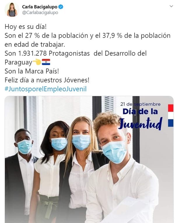 “Hoy es su día! Son el 27 % de la población y el 37,9 % de la población en edad de trabajar. Son 1.931.278 Protagonistas del Desarrollo del Paraguay. Son la Marca País! Feliz día a nuestros Jóvenes!”, escribió la ministra, junto con un flyer que utilizaba una foto sacada de un banco de imágenes gratuitas.