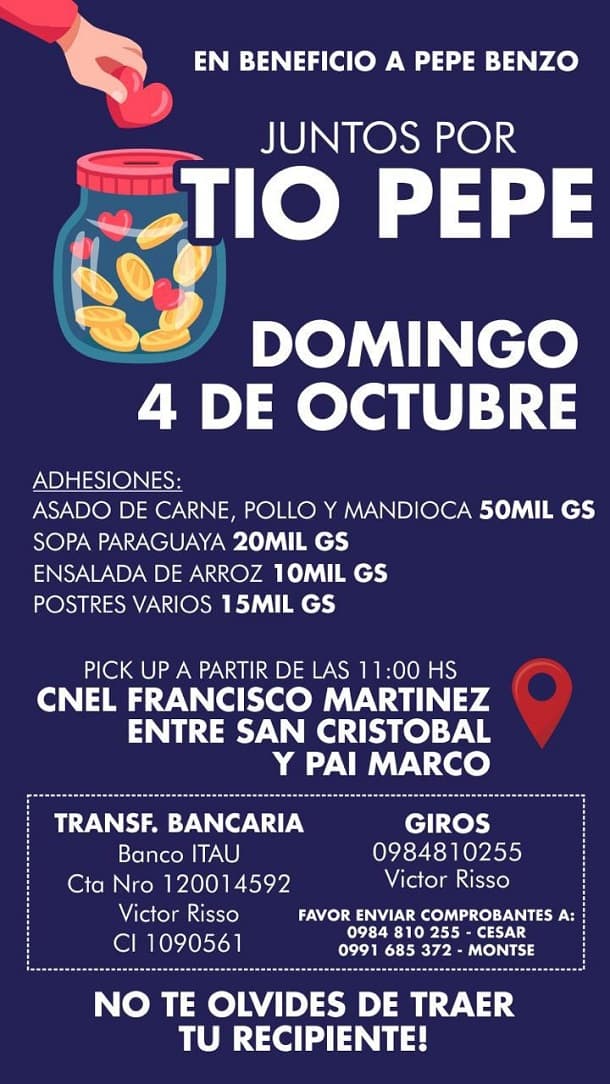 La actividad se realizará el domingo 04 de octubre, en una vivienda ubicada sobre las calles Coronel Marines esquina Pa’i Marco y San Cristóbal, a dos cuadras del frigorífico Guaraní, del barrio Santa Teresa.