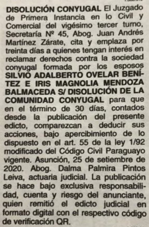 El texto del escrito publicado en un medio impreso y filtrado en redes sociales señala que el juez Juan Andrés Martínez Zárate “cita y emplaza por treinta días a quienes tengan interés en reclamar derechos contra la sociedad conyugal formada por los esposos Silvio Adalberto Ovelar Benítez e Iris Magnolia Mendoza Balmaceda s/disolución conyugal para que en el término de 30 días, contados desde la publicación de este edicto, comparezcan a deducir sus acciones”.