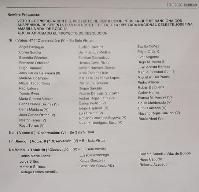 En este sentido se puede decir que dos procesados por la justicia tuvieron “autoridad moral” para sancionar a la colega, se trata de Tomás Ever Rivas, diputado colorado por Paraguarí, y Carlos Portillo, diputado liberal del Alto Paraná.