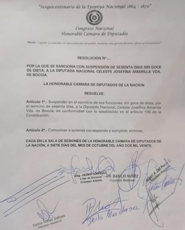 La diputada fue sancionada con la suspensión por una supuesta inconducta. La cuestión fue consumada gracias a 47 votos, de colorados y liberales.