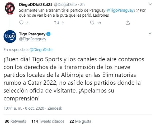 “Tigo Sports y los canales de aire contamos con los derechos de la transmisión de los nueve partidos locales de la Albirroja en las Eliminatorias rumbo a Catar 2022, no así de los partidos donde la selección oficia de visitante. ¡Apelamos su comprensión!”, publicó en redes sociales la firma Tigo, la principal operadora de cable del país.