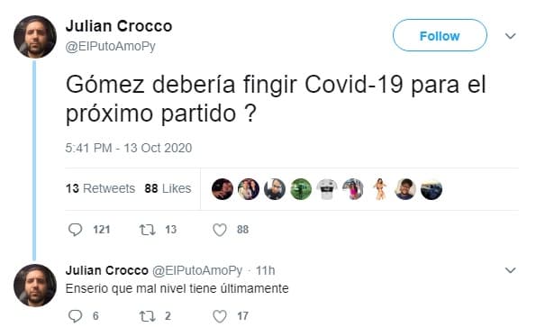 “Gómez debería fingir Covid-19 para el próximo partido ? (sic)”, lanzó el conductor del programa El Repasador, del canal Trece.