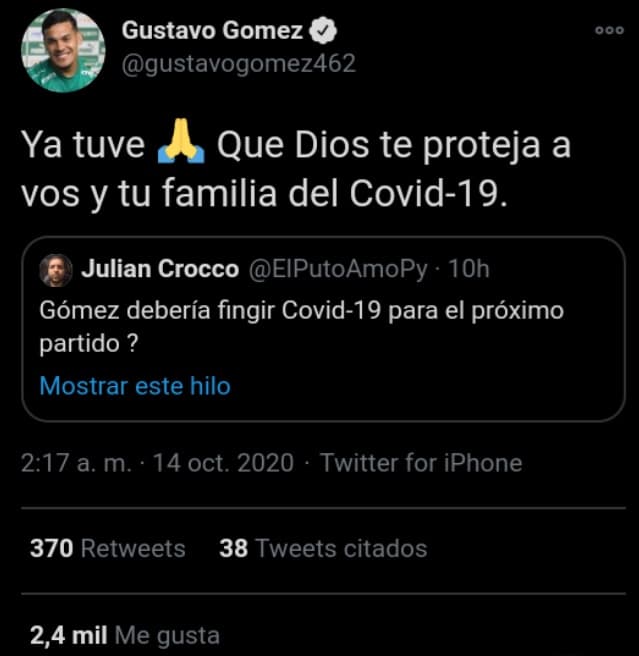 El capitán de la Albirroja no se quedó callado y respondió: “Ya tuve Que Dios te proteja a vos y tu familia del Covid-19”.